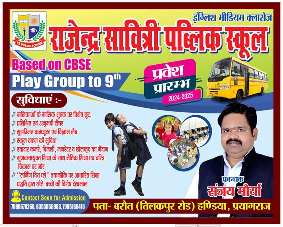 Established in year ___, Rajendra Savitri Public School is located in Rural area of Uttar Pradesh state of India. In area Baraut, Tilakpur Road of Handia district.